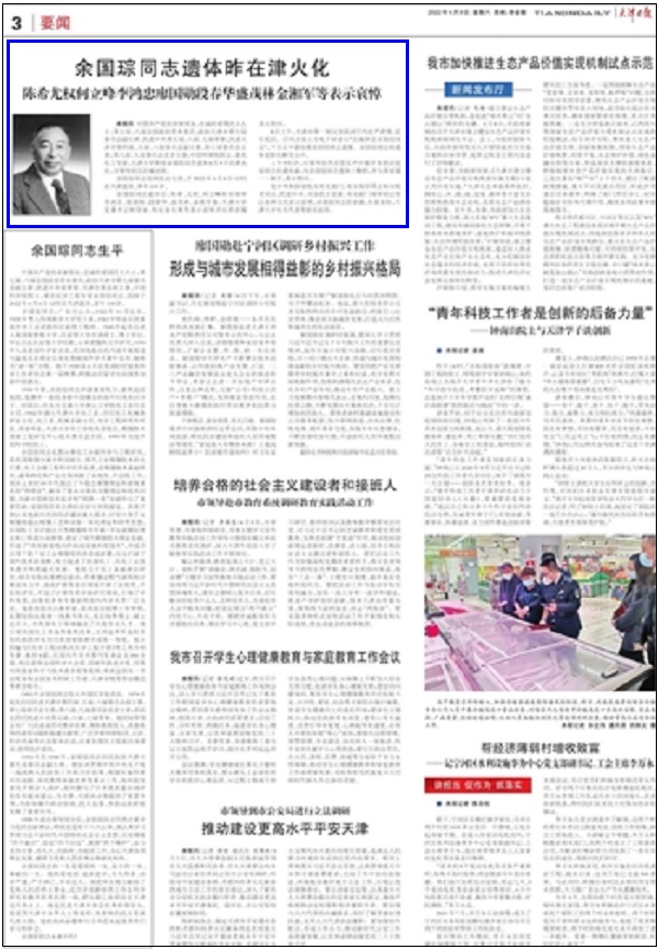 余国琮同志因病医治无效,于2022年4月6日12时在天津逝世,享年100岁。