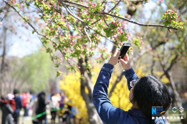 参加海棠季开放日的市民纷纷举起手机拍摄海棠花。(新华网张博摄)