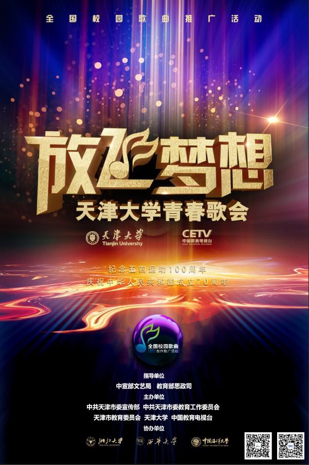 在中宣部文艺局、教育部思政司指导下,中共天津市委宣传部、中共天津市教育工作委员会、天津市教育委员会、天津大学、中国教育电视台 联合主办,浙江大学、中国海洋大学、西华大学协办,数百所高校参与、支持的《放飞梦想》天津大学青春歌会,即将于4月21日在天津大学求实会堂进行录制,以庆祝中华人民共和国成立70年周年和纪念五四运动100周年。