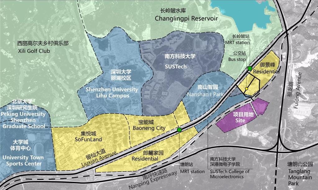 天津大学佐治亚理工深圳学院选址于南山区桃源街道白石岭片区,占地面积16.21公顷,总建筑面积约19万平方米,是西丽湖国际科教城的重要组成部分,往返宝安国际机场、福田口岸、蛇口码头、深圳北站皆有便利的交通条件。