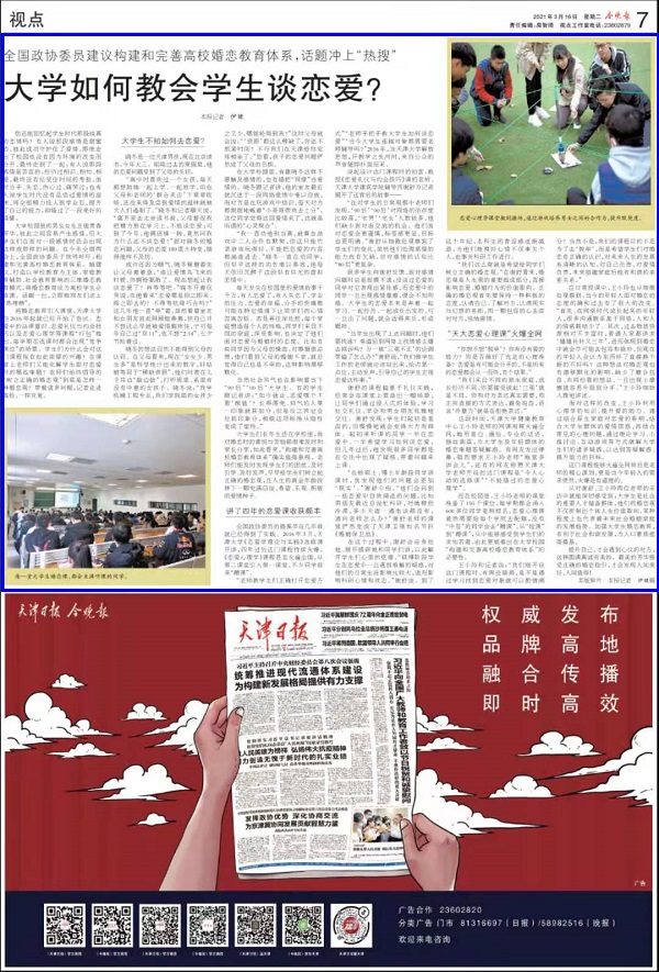 全国政协委员的提案早在几年前就已经得到了实践。2016年3月,天津大学《恋爱学理论与实践》选修课开讲,四年过后这门课程持续火爆,《恋爱心理学》课程甚至火遍全国,从第二课堂引入第一课堂,不少同学前来“蹭课”。