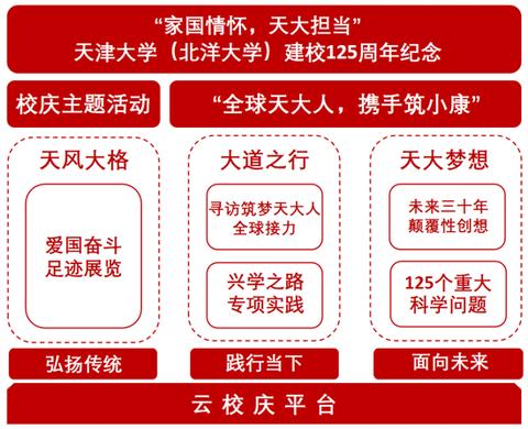 天津大学(北洋大学)建校125周年纪念活动的主题活动是“全球天大人,携手筑小康”。校庆期间,学校将举办“爱国奋斗的足迹”办学成果展,以主题展览的形式总结新中国成立以来天津大学爱国奋斗的足迹,弘扬“爱国奉献”之天大风格;学校将开展“兴学之路”教育扶贫专项实践,将希望火种撒向贫困地区,开展教育扶贫专项实践,建设100个北洋梦想教室;学校还将开展“寻访筑梦天大人”全球接力和“未来三十年”颠覆性创新创想论坛,激励海内外“天大人”敢于有梦、勇于追梦、勤于圆梦,胸怀天大梦想,成就天大事业。