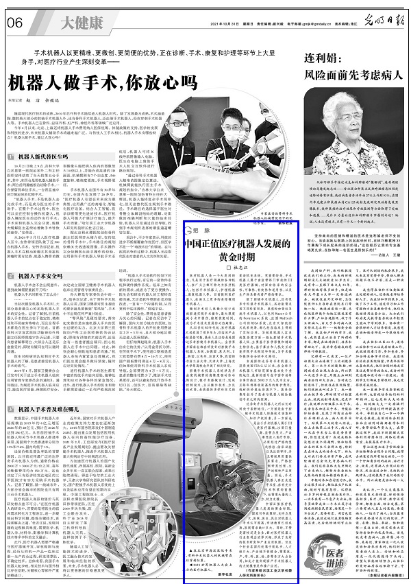 中国正值医疗机器人发展的黄金时期,国家引导政策好,支持力度大,医院、医生、民众对机器人手术认可度高,市场教育已经成熟,医院需求缺口巨大。同时,不管是高校还是企业,都对医疗机器人行业表现出浓厚兴趣,形成了良好的技术研发和产业应用氛围。但这个行业在国内还属于刚起步,人才缺口大、产业链不够健全,需要政、产、学、研、医、检、资等各方大力协同,如此才能实现国产手术机器人的大规模普及和推广应用。
