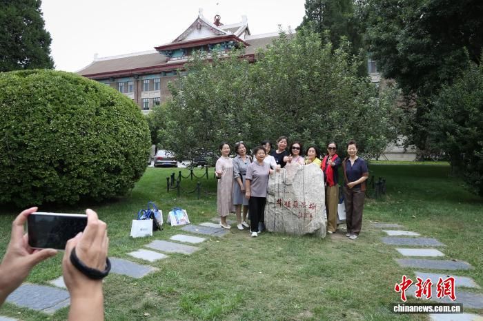 10月2日,校友在天津大学卫津路校区内与牛顿苹果树合影。中新社记者 佟郁 摄
