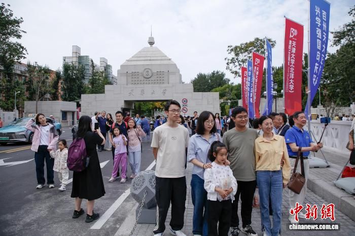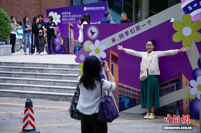 10月2日,校友在天津大学卫津路校区门前合影。中新社记者 佟郁 摄