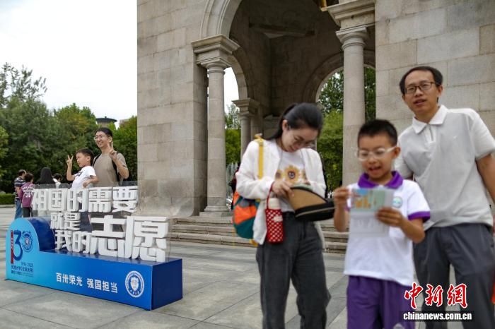 10月2日,校友在天津大学卫津路校区内与建校130周年主题标识合影。中新社记者 佟郁 摄