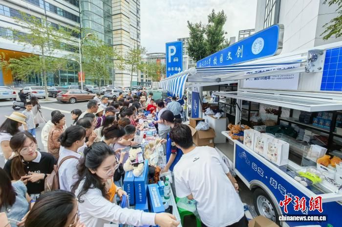 10月2日,校友在天津大学卫津路校区内购买建校130周年文创产品。中新社记者 佟郁 摄