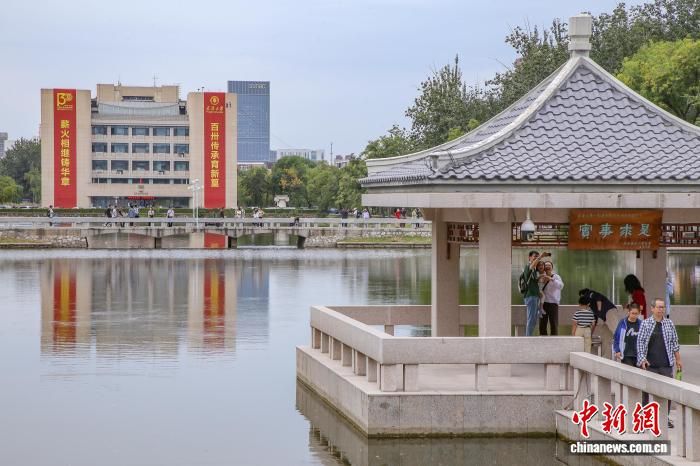 10月2日,校友在天津大学卫津路校区敬业湖求是亭内合影。中新社记者 佟郁 摄