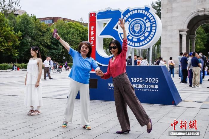 10月2日,校友在天津大学卫津路校区北洋广场与建校130周年主题标识合影。当日,天津大学迎来建校130周年校庆。天津大学前身为北洋大学,始建于1895年,是中国第一所现代大学,1951年定名天津大学。中新社记者 佟郁 摄