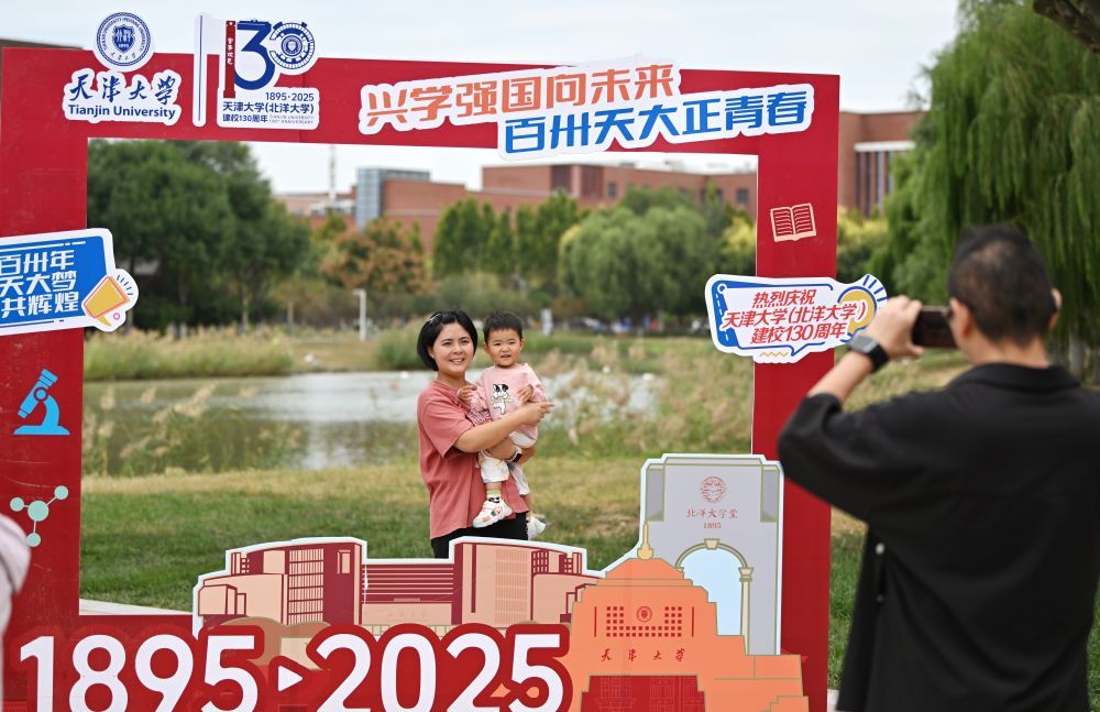 10月2日,天津大学校友带着孩子在北洋园校区留影。当日,天津大学(北洋大学)建校130周年高质量发展大会在北洋园校区求实会堂举办,海内外校友、各界来宾欢聚一堂,共同回望百卅历程。新华社记者 李然 摄