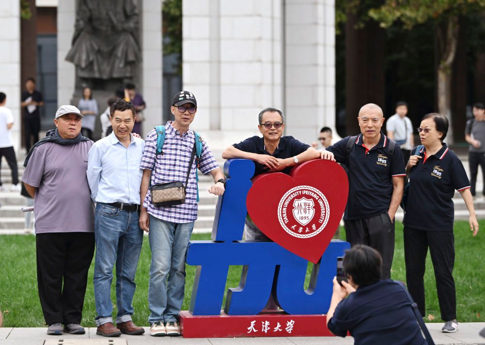 10月2日,天津大学校友在北洋园校区留影。当日,天津大学(北洋大学)建校130周年高质量发展大会在北洋园校区求实会堂举办,海内外校友、各界来宾欢聚一堂,共同回望百卅历程。新华社记者 李然 摄