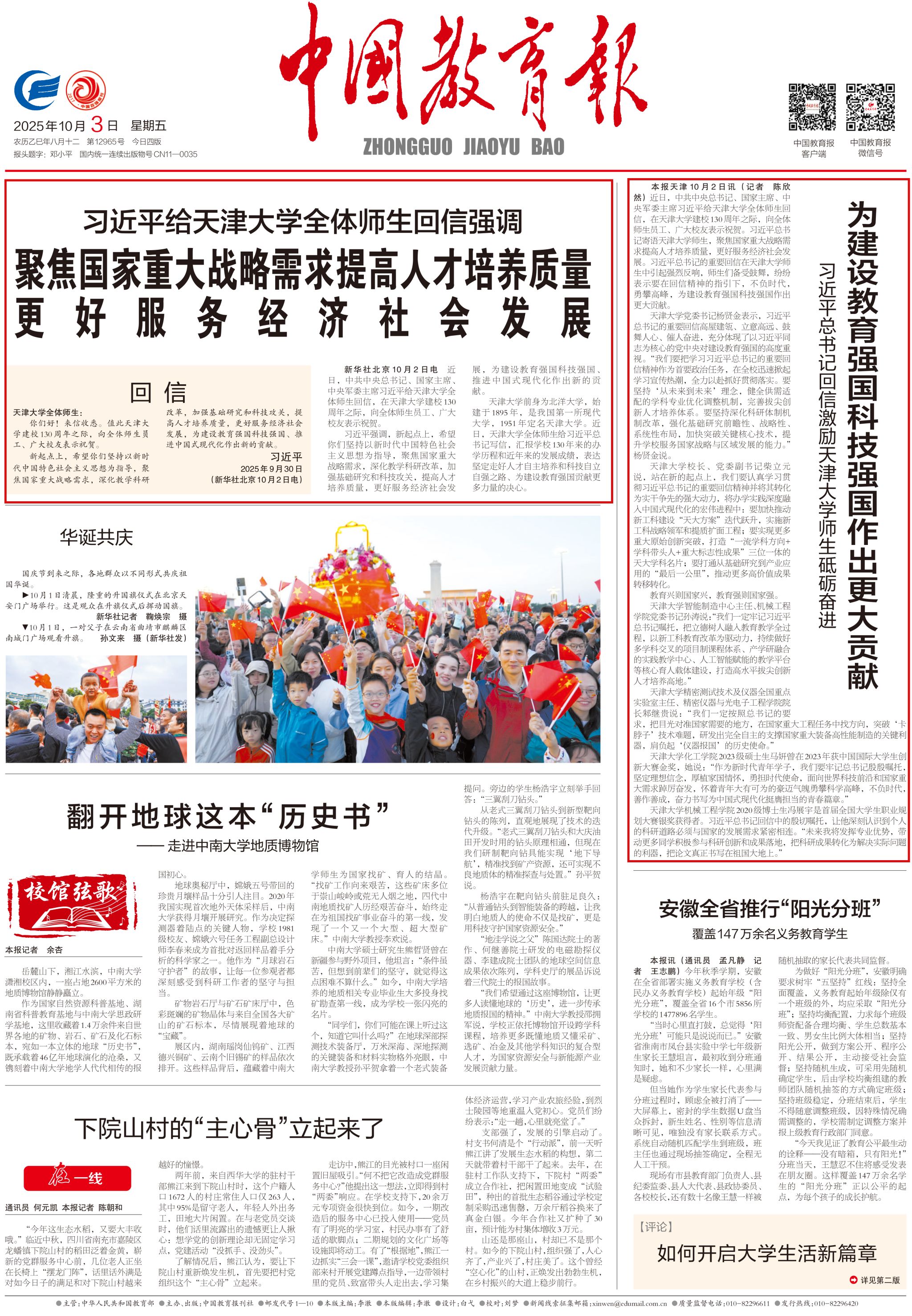 天津大学校长、党委副书记柴立元说,站在新的起点上,我们要认真学习贯彻习近平总书记的重要回信精神并将其转化为实干争先的强大动力,将办学实践深度融入中国式现代化的宏伟进程中:要加快推动新工科建设“天大方案”迭代跃升,实施新工科战略领军和提质扩面工程;要实现更多重大原始创新突破,打造“一流学科方向+学科带头人+重大标志性成果”三位一体的天大学科名片;要打通从基础研究到产业应用的“最后一公里”,推动更多高价值成果转移转化。
