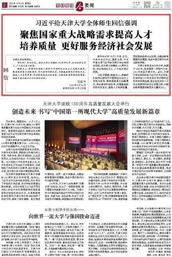 新华社北京10月2日电 近日,中共中央总书记、国家主席、中央军委主席习近平给天津大学全体师生回信,在天津大学建校130周年之际,向全体师生员工、广大校友表示祝贺。