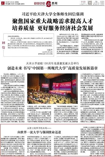 天津大学(北洋大学)建校130周年高质量发展大会圆满闭幕,“回信”蕴含的深切关怀与殷切期望,在天大师生和校友中引发强烈共鸣。师生及校友代表在接受记者采访时,纷纷表示深受“回信”鼓舞,并分享了各自的思考与感悟。