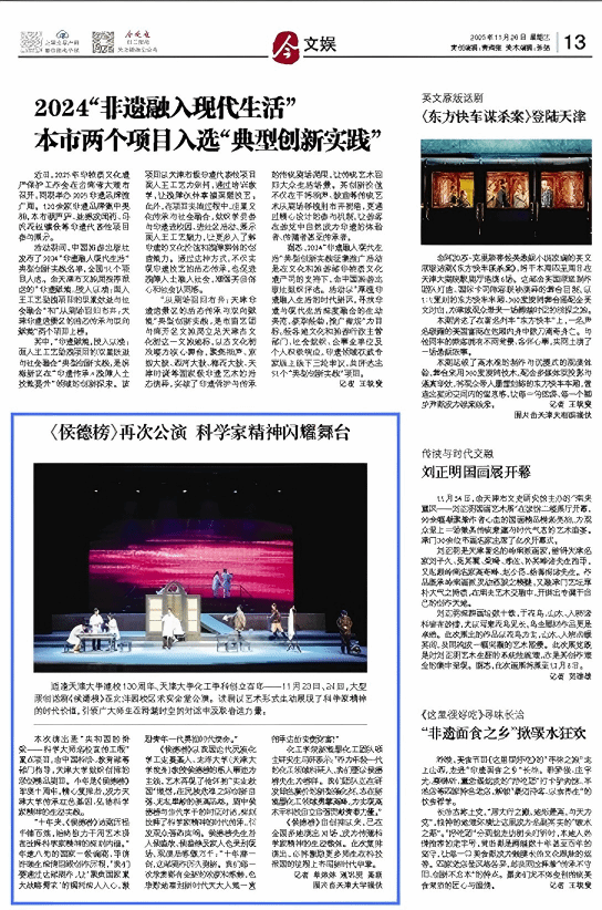 《侯德榜》以我国近代民族化学工业奠基人、北洋大学(天津大学前身)教授侯德榜的感人事迹为主线,艺术再现了他怀抱“实业救国”理想,在民族危难之际创新自强、无私奉献的崇高品格。剧中侯德榜与当代学子的时空对话,深刻诠释了科学家精神的时代传承,引发观众强烈共鸣。侯德榜先生后人侯盛欣、侯盛铮及家人也来到现场,观演后感慨万千:“十年磨一剑,这部剧作历久弥新。我们每一次欣赏都有全新的收获和感触,也欣慰地看到新时代天大人能一直传承这份宝贵财富!”