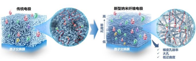 “理想的燃料电池电极结构应具备良好的三相反应界面,能够促进电池内部的气体扩散与液态水管理。”焦魁教授介绍,相比传统颗粒堆叠电极,该新型电极具有梯度孔隙率、更大的孔和更低的迂曲度,可明显改善低铂燃料电池的电化学性能和耐久性。