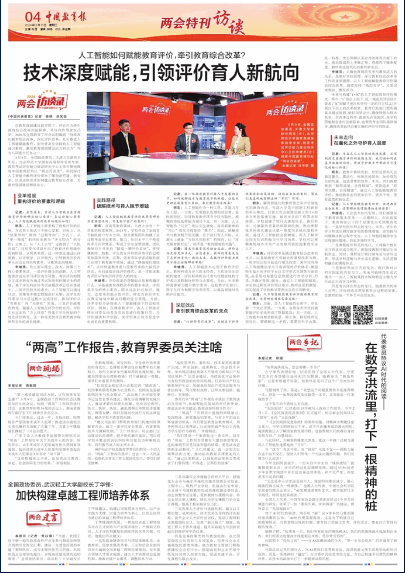 3月9日,全国政协委员、天津大学副校长明东,北京师范大学国家高端智库首席专家、教育考试评价能力建设研究中心主任申继亮做客中国教育报刊社“两会访谈录”,共同探讨人工智能为教育评价带来了哪些新可能、新变革,以及这些变革如何撬动教育综合改革,为教育强国建设增添动力。
