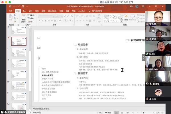 参加本次毕业设计中期检查的共有349名学生,50余位评审专家。中期答辩共分为21个小组,在各专业毕设负责人的组织下顺利开展。每位同学按顺序依次进行PPT展示,重点就研究目标和意义、研究内容,目前工作进度和成果、存在的问题和下一步工作计划等几方面进行了汇报。评审专家围绕每名学生的汇报内容进行提问,并提出相应的指导意见,特别询问了同学们在疫情期间遇到的工作条件等方面的困难,并给出了建议。整个中期检查过程高效流畅,师生们在云端就毕业设计工作进行了有效的沟通和交流。