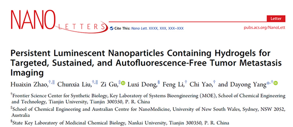 近期,天津大学化工学院仰大勇教授课题组设计合成了一种长余辉水凝胶(PL-gel),用于肿瘤转移的可视化成像研究。PL-gel由肿瘤特异靶向性的长余辉纳米探针和生物相容性良好的海藻酸钠水凝胶构成,能够靶向识别、持续标记肿瘤细胞,并实现无自发荧光的肿瘤转移成像。长余辉纳米探针能够在无外界光激发时,持续发出近红外光,实现无背景干扰的深组织成像。通过表面修饰肿瘤特异性配体,可以实现受体介导的特异性肿瘤识别和标记。PL-gel生物相容性好,不影响肿瘤的转移和侵袭,并具有很高的灵敏度。PL-gel在转移性乳腺癌小鼠模型的肿瘤部位可以持续释放标记探针,克服巨噬细胞的干扰,特异性标记肿瘤细胞,实现肿瘤转移的无创、高选择性、无背景干扰成像示踪。该长余辉水凝胶可以针对各种类型的癌细胞进行定制化设计,从而为各种肿瘤转移研究提供通用性平台。