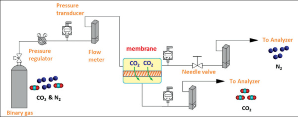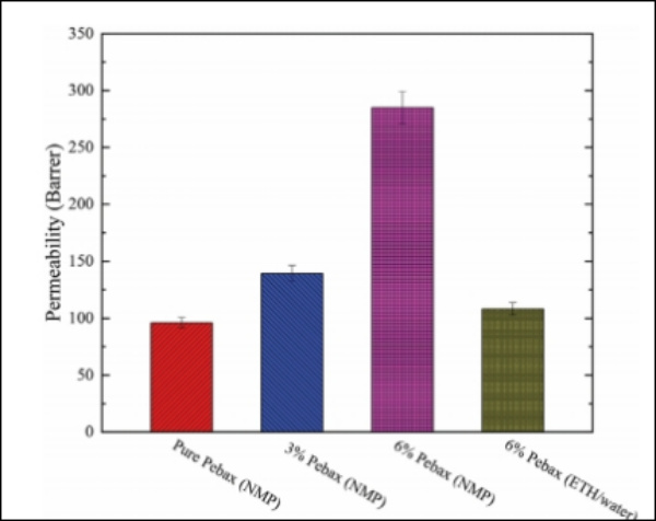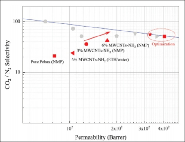 目前,CO2捕集技术存在成本高、能耗大等技术瓶颈。膜分离技术作为高效节能、操作简单的分离技术能够一定程度上克服该难题,其中混合基质膜是具有良好发展潜力的一类膜材料。该团队以聚醚嵌段聚酰胺为基质膜材料,以氨基改性后的碳纳米管为负载剂,探究了溶剂的类型对膜制备过程中负载剂分散和膜CO2/N2分离性能的影响。该研究结果表明,采用N-甲基吡咯烷酮为溶剂制备的混合基质膜具有优良的气体分离性能,其结果接近罗伯森上限,是一种具有潜力的燃烧后碳捕集膜材料。
