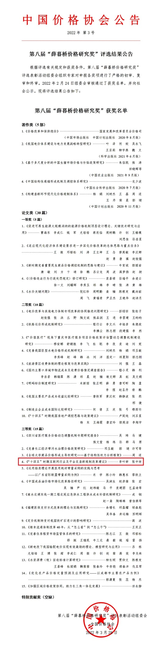 本站讯(马寅初经济学院供稿)第八届“薛暮桥价格研究奖”组委会和中国价格协会近期公布了通过严格的初审、复审和终审并经过社会公示后的获奖名单,30篇论文和5部著作获得三年一度的中国价格研究领域的最高奖项。国家发展和改革委员会经济体制与管理研究所副研究员李叶妍博士与天津大学马寅初经济学院创院院长、卓越教授,国家能源、环境和产业经济研究院院长张中祥合著的论文“十四五时期互联网行业及平台反垄断规制改革建议”荣获第八届“薛暮桥价格研究奖”论文奖。该论文充分剖析中国互联网行业及平台反垄断规制改革的经验教训,借鉴美日德等网络市场发达国家的相关制度设计,总结影响当前及今后一个时期互联网行业及平台反垄断的体制机制障碍,为“十四五”时期中国互联网领域深化反垄断规制改革创新提供启示及下一步工作建议。