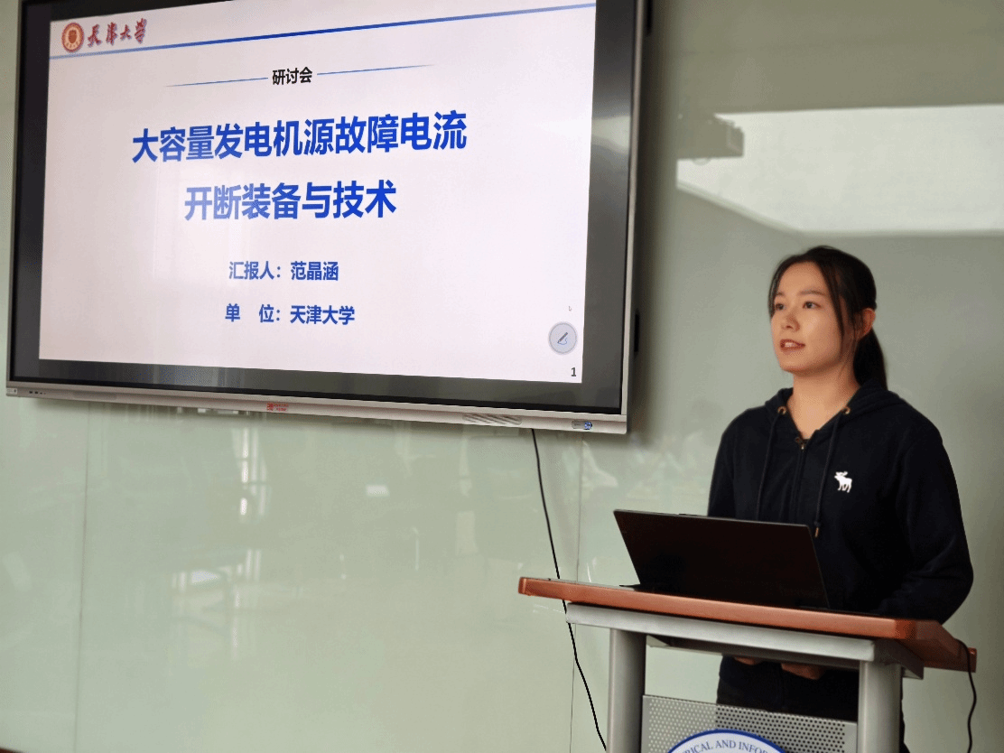 在专题报告环节,多位青年学者分享了最新研究成果。范晶涵博士就《大容量发电机源故障电流开断装备与技术》展开汇报,其面向发电机源故障电流环保型快速开断难题,提出新型真空发电机断路器拓扑与快速开断方法,并结合多断口磁耦合均流和智能选相控制等关键技术,实现大容量发电机断路器的开断可靠性和工程可行性的显著提升。