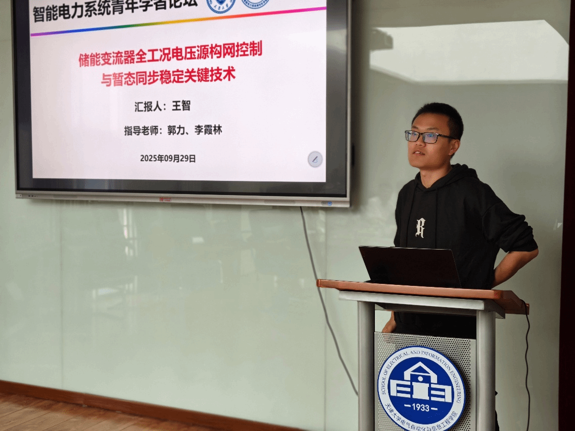 储能技术为大规模新能源开发和高比例并网带来的电力系统稳定问题带来了有效解决手段,郭力教授、李霞林教授课题组王智博士围绕《储能变流器全工况电压源构网控制与暂态同步稳定关键技术》展开汇报,针对构网型储能变流器故障时易失电压源特征、暂态同步不稳等问题,王博士开展了储能型储能全工况维持电压源特征与暂态同步稳定关键技术研究,为实现构网型储能主动支撑新型电力系统复杂工况下的安全稳定运行提供理论和技术支撑。