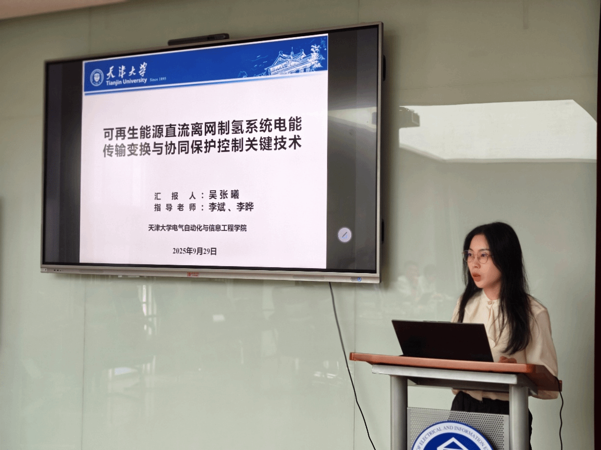 除了电化学储能,氢储能作为一种可长期存储、高能量密度的清洁能源也受到了国内外学者的广泛的关注。李斌教授课题组将可再生能源与制氢技术结合并开展了相关工作,课题组吴张曦博士就《可再生能源直流离网制氢系统电能传输变换与协同保护控制关键技术》项目汇报了研究进展和下一步工作,团队在电氢耦合系统建模、内外部故障特性分析以及考虑制用氢设备寿命的运行策略与配置等方面取得一定的成果,目前在北洋园校区构建了电氢储微电网实验平台并开展相关研究工作。