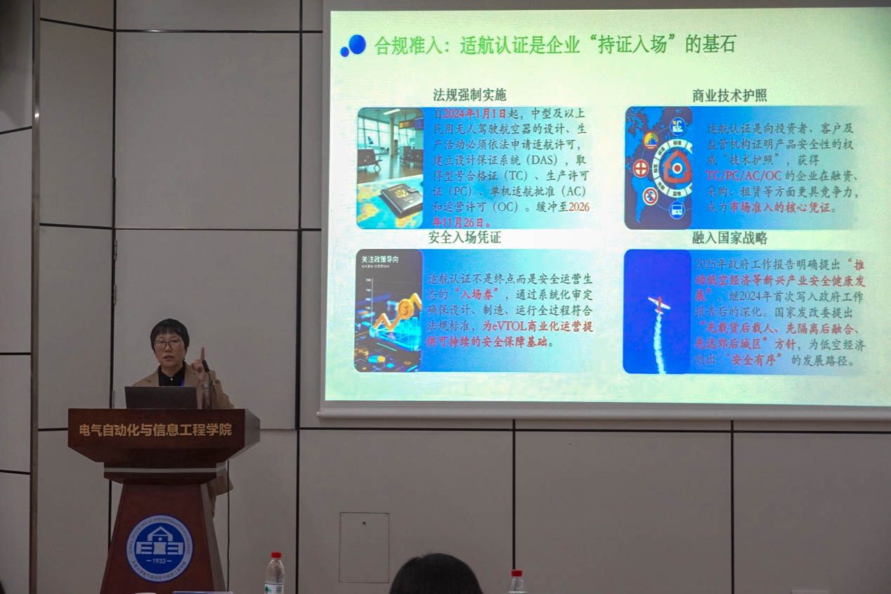 天津尚飞航空科技有限公司工程师孙凤琴作《eVTOL型号安全性设计和适航符合性验证》报告,介绍了基于AC-21-40指南的安全性设计与适航验证体系,重点阐述了危害分级、系统冗余及全流程验证等关键环节,展示了eVTOL型号在安全与适航管理方面的最新进展。
