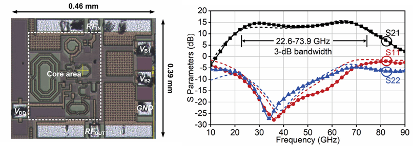 针对这一问题,天津大学团队研制了一款覆盖22.6–73.9 GHz的超宽带低噪声放大器。提出一种协同均衡设计思路,首级引入集电极–基极并联反馈与双电感峰化结合的匹配网络以拓展带宽并抑制噪声,次级采用谐振反馈补偿均衡技术改善高频增益滚降与增益平坦度,实现对全部5G NR FR2频段及潜在NR-U频段的单芯片支持。基于以上技术,团队采用0.13 μm SiGe工艺完成了流片验证,并进行了性能测试。测量结果表明,芯片实现3 dB带宽51.3 GHz,峰值增益15.2 dB、平均增益13.8 dB,噪声系数4.06–4.94 dB,OP1dB为-7.4至-2.8 dBm,核心面积0.06 mm²、功耗17.5 mW,综合性能达到国际先进水平。