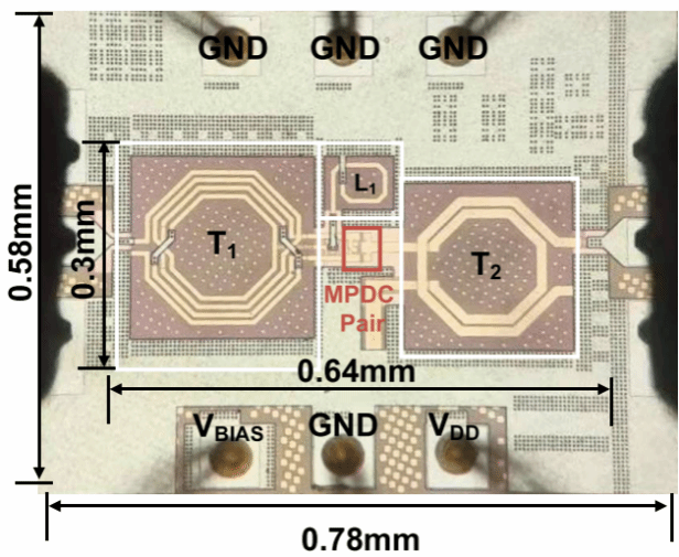 针对这一挑战,天津大学团队研制了一款覆盖 19 - 45 GHz的超宽带高效率倍频器。该倍频器提出了一种新型多端口达林顿单元(MPDC)作为倍频器的谐波发生核心。提出的MPDC结构,通过在MPDC的输出端口到输入端口间引入二次谐波正反馈路径,抵消了由晶体管密勒电容产生的二次谐波负反馈,从而实现了倍频效率的倍增。同时,提出倍频器采用了谐波极点交错技术,通过对输入基波和反馈二次谐波的分离调控,实现了倍频带宽的扩展。最后,基于55 nm CMOS工艺,实现了一款工作在19 - 45 GHz (81.25%相对带宽),同时倍频效率高达23.2%的毫米波宽带倍频器。该倍频器通过新架构与新理论的结合,打破了传统倍频器带宽与效率的“Trade-off”,综合性能达到国际领先水平。