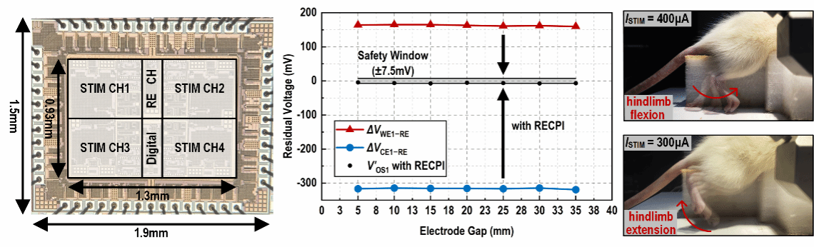 针对这一问题,天津大学团队研制了一款新型神经电刺激器芯片,提出一种创新的三极刺激器结构及基于该结构的有源电荷平衡技术,最终使残余电压“有效”控制在安全窗口以内。基于以上技术,团队采用0.18 μm CMOS工艺完成了流片验证,并进行了电学与溶液测试以及动物实验。电学和溶液测试结果表明,刺激器的最大电压顺应性为±10.4V,刺激电流输出范围为0.1~2.8mA。在多个通道同时进行刺激下,所有电极的残余电压控制在±7.5mV以内,实现了有效的电荷平衡。进一步的大鼠脊髓刺激实验中,该芯片成功诱发了后肢屈曲与伸展动作,充分证明了所研制神经电刺激器在实际神经调控应用中的功能可行性与应用潜力。与现有先进技术相比,所提出的刺激器是首个同时实现高空间分辨率并且在时空刺激条件下进行有效的双极刺激中电荷平衡的设计。