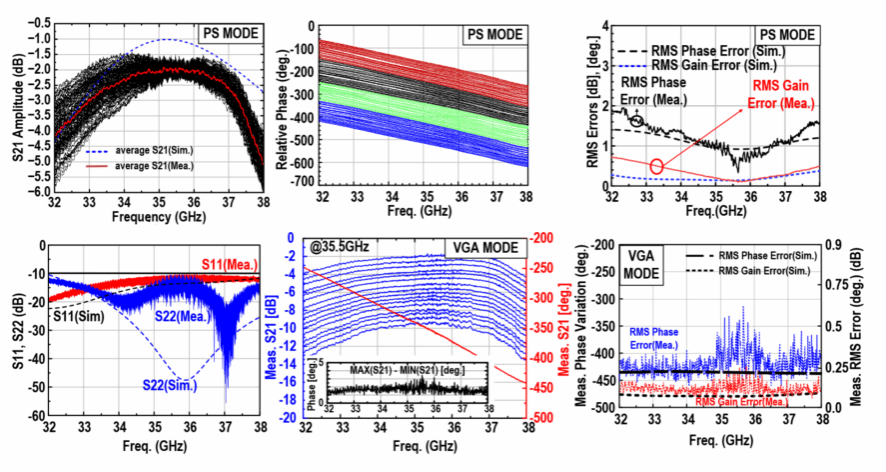 针对上述瓶颈,天津大学团队提出了一种基于阻抗恒定矢量调制的Ka波段可变增益移相器。该设计在0.13 μm SiGe BiCMOS工艺下实现,创新性地引入负反馈磁耦合补偿结构构建阻抗恒定VGA,通过耦合电感与反馈电阻协同作用,有效抑制不同增益状态及偏置电流下VGA输入、输出端口阻抗的变化,从源头保障IQ发生器的幅相精度。芯片工作在32–38 GHz频段,支持7位、全360°相位分辨率以及4位、7.5 dB动态范围的增益调节。测量结果表明,在相移模式下,中心频率35.5 GHz处的RMS相位/幅度误差分别仅为0.33°/0.10 dB,在可变增益模式下则进一步压缩至0.23°/0.08 dB,且在全频段内RMS相位/幅度误差均小于约1.9°/0.93 dB。芯片核心面积约0.51 mm²(版图尺寸约1062 × 534 μm²),直流功耗仅为7.4–12.2 mW,同时保持稳定的输出IP1dB(-5.2至-6.5 dBm),在宽带、高精度及低功耗等指标上均达到国际先进水平,为新一代高精度毫米波相控阵前端提供了紧凑、高集成度的相控解决方案。