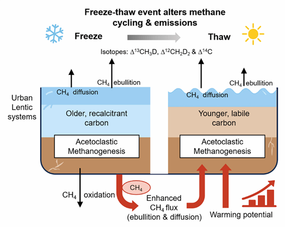 温室气体从内陆水体排放至大气,是全球变暖的重要驱动因素之一。季节性冻融事件作为温带与寒区城市水体的典型过程,其对甲烷(CH4)产生、转化与排放的影响机制尚不明确。近期,我院研究团队结合水地球化学调查、稳定同位素、团簇同位素及放射性碳同位素等多种同位素手段,系统揭示了城市水体在冻融过程中甲烷生物地球化学循环模式。