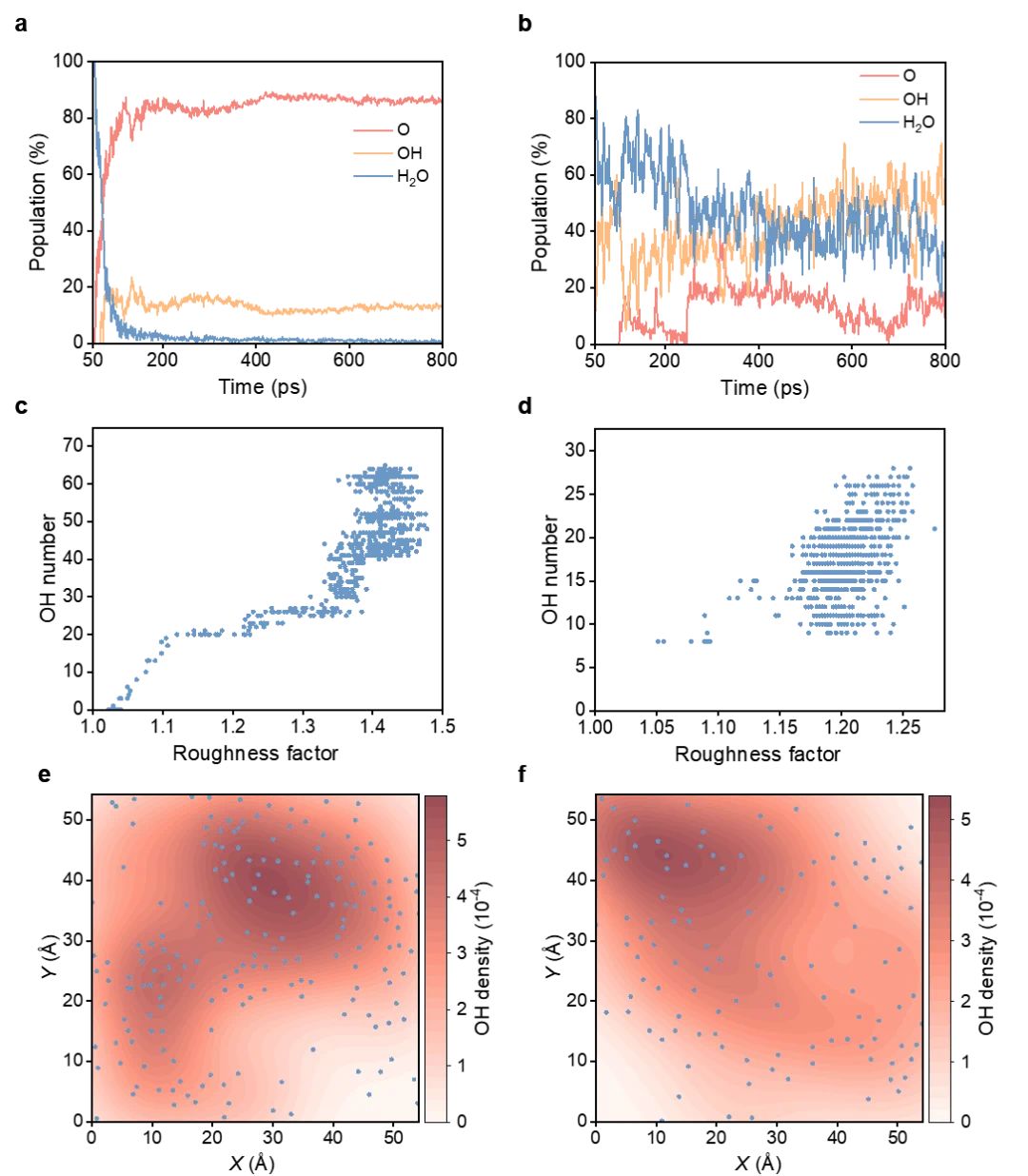 接下来回答得关键问题是哪一种含氧物种在主导这一过程?因此进一步分析了粗糙铜表面上氧相关物种的时间演化。结果表明,在 纯H2O体系中,OH在初始阶段后迅速增多并保持为主导表面物种,明显多于O原子和未解离的H2O;在H2O/O2混合体系中,虽然表面同时存在O和OH,但表面粗化程度与OH数量之间呈现出明确正相关。空间分布分析进一步显示,OH密度较高区域与强低配位表层Cu原子的分布高度一致,说明OH并非只是伴随中间体,而是驱动表面粗化和无序化的关键活性物种。(如图5)