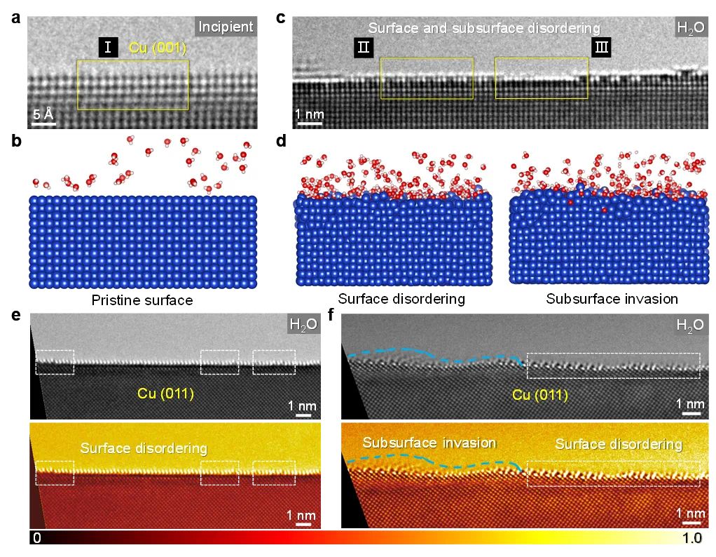 图3. 纯水蒸气条件下铜表面的结构响应。原位HR-TEM结果表明,H2O可诱导Cu(001)表面及次表层无序;Cu(011)表面存在类似现象,说明水会直接引发表面结构失稳。