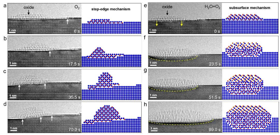 图1. 原位 HR-TEM 直接比较 Cu(001) 表面在纯O2和H2O/O2混合气氛下的初始氧化行为。在纯O2中,氧化主要沿台阶位点发生,表现为 step-edge 机制;在H2O/O2混合气氛中,表面氧化岛更快向次表层侵入,表现为subsurface机制。