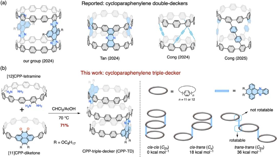 环对苯撑(Cycloparaphenylene,CPP)是一类由对位连接的苯环构成的环状π共轭分子,其结构可看做碳纳米管的分子片段,被认为是研究碳纳米管结构和性质的重要分子模型。近年来,人们已经成功合成多种具有明确分子结构的分子纳米带和分子纳米管,并证明了这些分子材料在响应型材料开发、客体识别等领域的重要应用潜力。此前,以CPP为封端结构的双层分子纳米管已被成功合成。但受结构复杂性和本征张力限制,三层的管状CPP分子的自下而上精准合成一直未能实现。