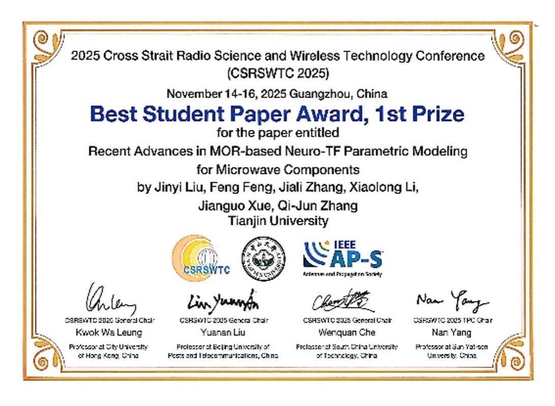 本站讯 11月14日至11月16日,第28届海峡两岸无线科学与技术会议(CSRSWTC 2025)在广州召开。本届CSRSWTC会议共录用论文397篇,其中63篇参与最佳学生论文竞赛。经过综合评审,最终评选出6篇最佳学生论文,包括1名一等奖,2名二等奖和3名三等奖。天津大学微电子学院互联感知集成电路与系统团队冯枫教授课题组的博士生刘谨仪,以其论文《Recent Advances in MOR-based Neuro-TF Parametric Modeling for Microwave Components》最终从63篇投稿学生论文竞赛的论文中脱颖而出,荣获最佳学生论文竞赛奖的唯一一等奖,指导教师为冯枫教授。
