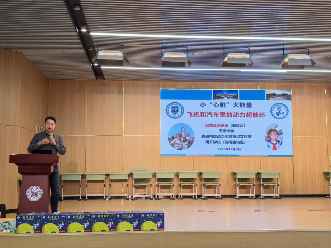 为深入贯彻落实习近平总书记关于科技创新与科学普及的重要指示精神,切实推进全国高校“双带头人”党支部书记“强国行”专项行动建设,2025年12月9日上午,先进内燃动力全国重点实验室党支部(以下简称实验室支部)赴天津市海河教育园区南开学校瑞明路校区开展了“科教融合育棠苗 科普赋能强国行”专题科普活动,并进行了科普赋能站揭牌仪式。先进内燃动力全国重点实验室副主任李云强、南开学校瑞明路校区管理部部长胡小玉出席活动。