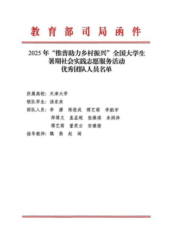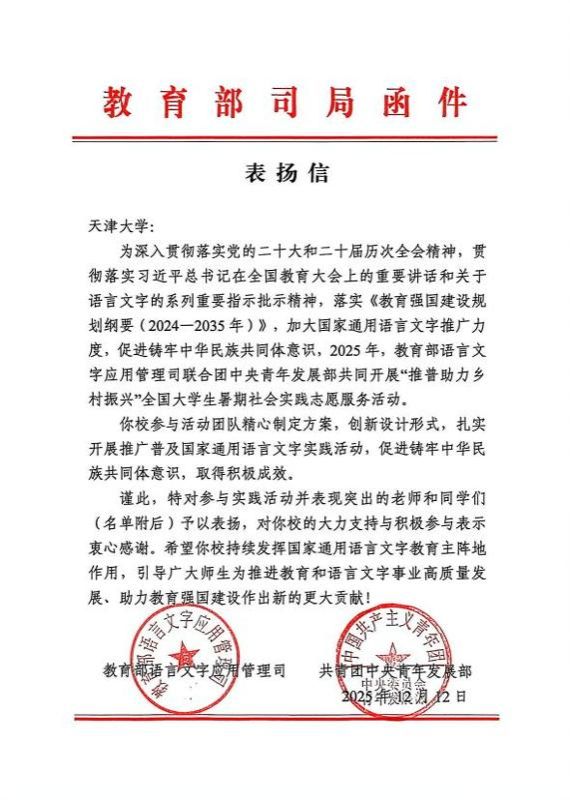 本站讯 近日,由教育部语言文字应用管理司、共青团中央青年发展部共同主办的2025年“推普助力乡村振兴”全国大学生暑期社会实践志愿服务活动评优结果揭晓。天津大学教育学院“E宕情深”实践队从全国1680所高校、8103支团队中脱颖而出,成功入选“推普助力乡村振兴”全国大学生暑期社会实践志愿服务重点团队,并在全国1000支重点团队及1000支协同团队中获评全国优秀团队。教育部语言文字应用管理司、共青团中央青年发展部特向天津大学致信表扬,充分肯定天津大学青年学子在推广普及国家通用语言文字、服务乡村全面振兴中的积极作为与实践成效。
