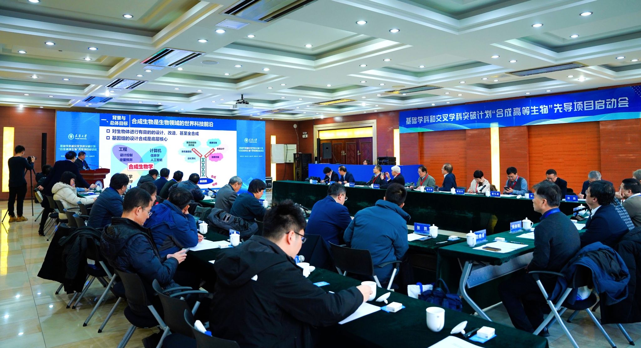 1月8日上午,由教育部、财政部联合部署的基础学科和交叉学科突破计划“合成高等生物”先导项目启动会在天津大学卫津路校区科学图书馆举行。该项目剑指十五五未来战略产业,10名院士和2位专家作为咨询专家组出席会议,为项目实施提供咨询指导。天津市副市长张玲,市教委、市科技局等相关部门负责人,来自清华大学、北京大学、南开大学、江南大学的项目组成员及科研骨干齐聚津门,共同讨论项目组织实施。