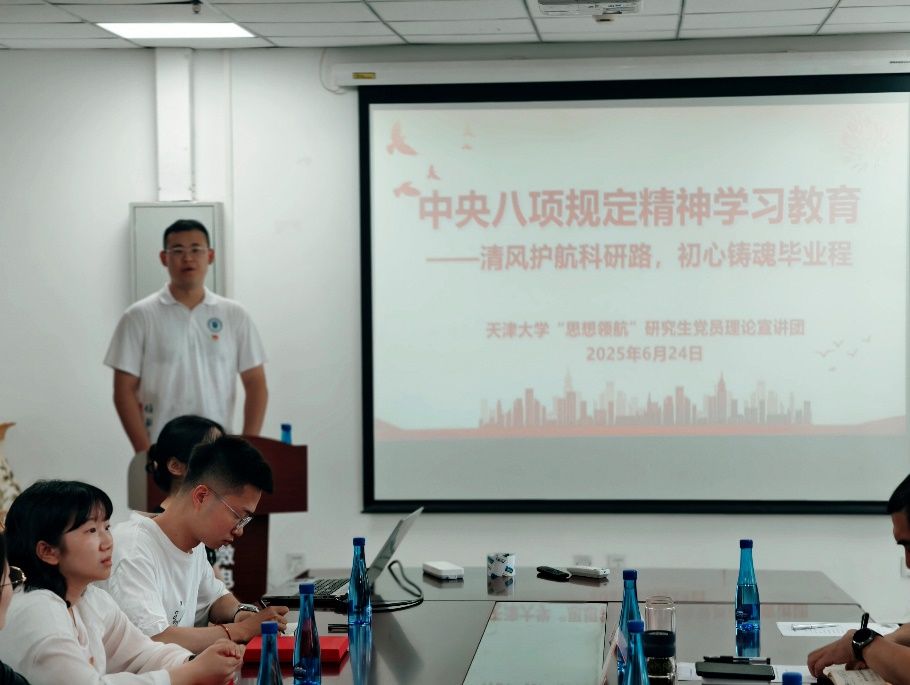 王礼泽进行《清风护航科研路,初心铸魂毕业程》主题分享。他从清风铸魂、规矩立身和行稳致远三个方面,以中央八项规定精神校准初心坐标、于科研攻坚淬炼实事求是校训底色、从校园党课到社会考场的作风接力三个维度,与大家分享学习中央八项规定精神的感悟,呼吁大学生党员应当以身作则,严格遵守纪律规范,以实际行动树立遵规守纪的表率。