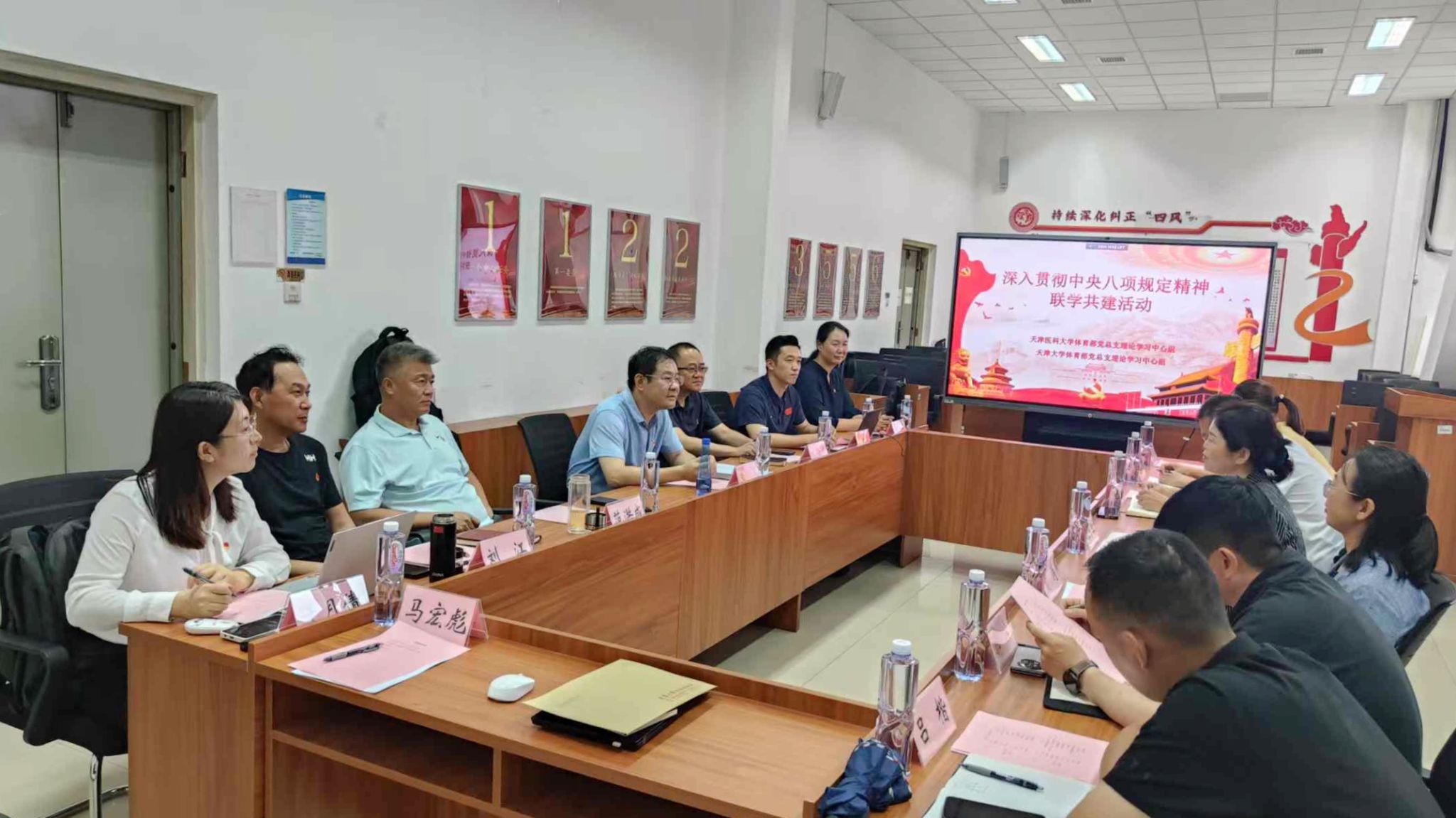 7月3日,天津大学体育部党总支理论学习中心组与天津医科大学体育部党总支理论学习中心组于我校卫津路校区体育部党员活动室,共同开展“深入学习贯彻中央八项规定精神,以优良作风推动事业发展”理论学习中心组(扩大)联组学习活动。天津医科大学体育部党总支书记、主任张秀敏,党总支副书记于涛,副主任安义德;我校体育部党总支书记、主任李磊,场馆中心主任、体育部副主任(兼)陈宝禄,副主任范洪成、陈田希,以及两校体育部部分党员教师代表参加此次活动。活动由李磊主持。