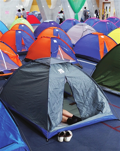 开学季,大学校园周边的宾馆总是一房难求。许多陪同报到的家长只能选择在学校内打地铺。从2012年开始,天津大学搭建“帐篷房”为新生家长提供免费的临时住宿,今年已经是第六年了,而且每年的帐篷越搭越多,从最初的200多顶,到今年的800余顶。
