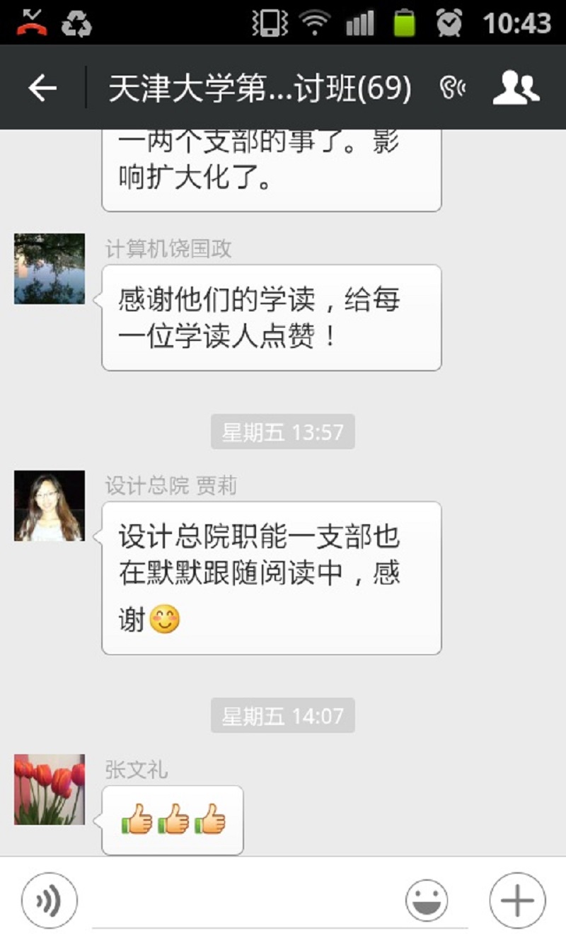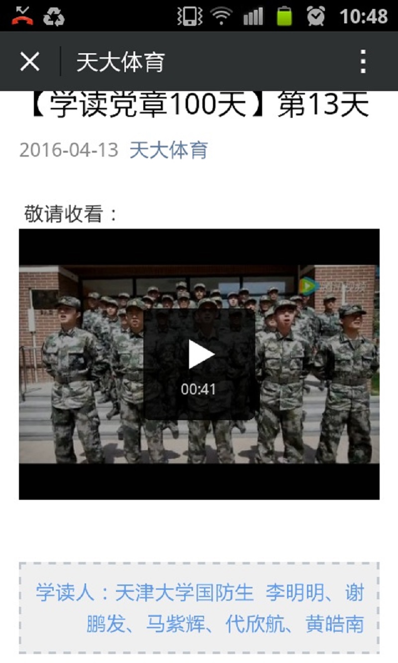 “学读党章100天”活动在微信公众平台“天大体育”上发布学读音频视频材料,目前体育部党总支32名在职党员和2名入党积极分子都积极参与到“学读党章100天”活动中,并带动我校国防生集体、第18届研究生支教团、理学院、建筑学院等参与其中。“学读党章100天”通过在微信群和微信朋友圈传播后,收到了很好的反响,有党员表示“这给了大家一个很好的学习途径”,“他们的活动给了我们能量”,“感谢他们的学读,给每一位学读人点赞”,很多党员同志也纷纷表示将加入到“学读党章100天”活动中。