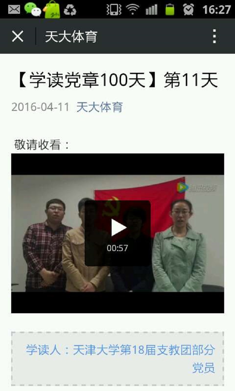 本站讯(通讯员 潘军强)为落实天津大学《关于在全体党员中开展“学党章党规、学系列讲话,做合格党员”学习教育方案》部署和要求,结合体育部实际,体育部党总支开展“学读党章100天”活动,旨在带领大家行动起来,共同学习党章,引导党员自觉按照党员标准规范言行,进一步坚定理想信念,增强党员意识,加强党性修养,尊崇党章,遵守党章,努力做合格党员。