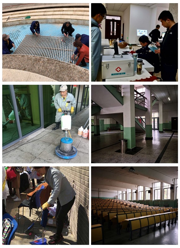辛勤物业强保障。后保部积极做好清洁工作,对校园喷泉池进行调试清刷,对重要活动场地如西阶教室、校史博物馆、24号楼药学院、16号楼地科院、25楼和26楼活动点等做了全方位的清洁打扫,逐楼逐层进行巡视检查,发现卫生不合格项,立即进行整改,确保卫生清洁无死角;活动当天保洁人员也坚守岗位,打扫地面,定时整理卫生间,确保为来宾提供舒适、干净整洁的环境。工作人员维护好秩序,做好多方保障。为保证活动顺利进行,物业提前配合有关单位做好活动现场布置等工作,及时检修各楼宇大厅及会议室内线路、调试多媒体设备等,保障水、电设施设备正常使用。活动当天,物业人坚持热情服务于每一位进场的校友及师生,维持现场秩序,引导参观者文明出入。由于天气炎热,服务大厅还配备了医药箱,以备不时之需。