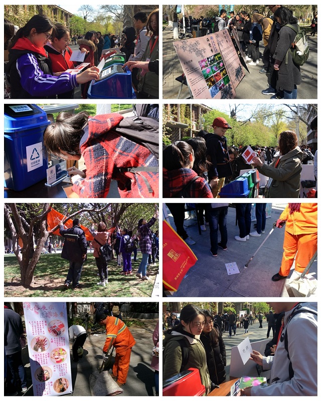 环境课堂巧育人。海棠季的成功举办离不开良好的环境保障,为了迎接海棠季的到来,校园环境管理科早在一月份就进入了临战状态,预测海棠花期、修剪海棠树型,平整草坪、修剪校园植物、防治病虫害,整修喷泉、试水试喷,清洗翻新校园雕塑、冲洗广场及道路,全面保障了校园环境的整洁和美观。在活动拉开序幕之际,部门分管领导和校园环境管理科的负责人员走遍了卫津路校区的每一个角落,全面检查了校园的卫生和绿化情况,为海棠季的顺利进行提供了有效的环境保障。活动当天,为了履行“环境育人”的职责,校园环境管理科还开展了“环保小课堂”的活动,通过展板和互动游戏向游人宣传了垃圾分类和植物科普两个方面的内容,并以衣物分类为切入点,号召大家将闲置衣物通过有效途径分类处理。