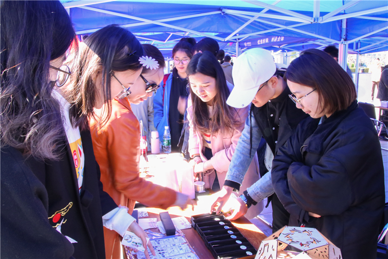 手绘扇子的展位前聚集了不少学生和市民,他们提起笔或笨拙或灵巧地在洁白的扇面上绘上喜欢的图案并题词,身着汉服、轻摇团扇,行人熙熙攘攘,仿佛回到了古时的街道。